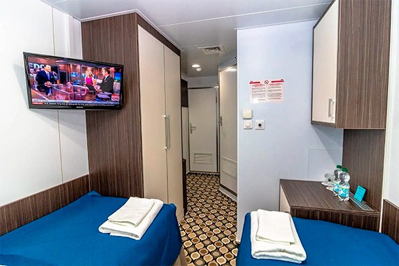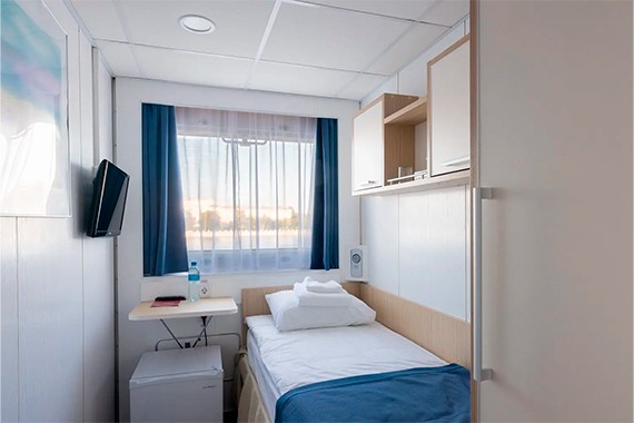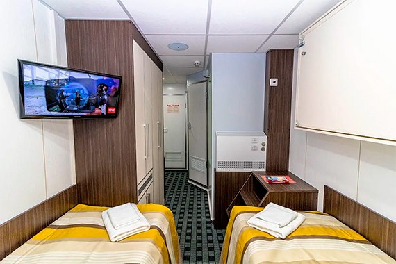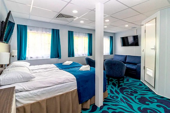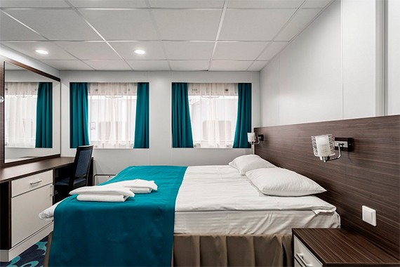 Площадь кают увеличена в 1,5 раза, полностью заменена мебель и фурнитура, напольные покрытия, установлена новая сантехника, душевые кабины. Номера оснащены санузлом с душевой, кондиционером, холодильником, телевизором и феном.