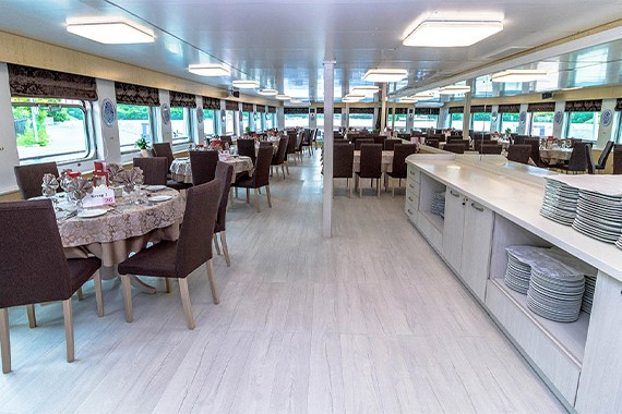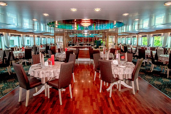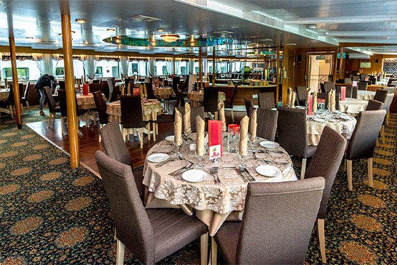 Пассажирам доступны лучше блюда русской, итальянской, французской, азиатской и вегетарианской кухни. В ресторанах можно заказать борщ, пельмени, шашлык, блины, нежные пасты, ароматные пиццы, жаренные устрицы, свежие суши и изысканные десерты.