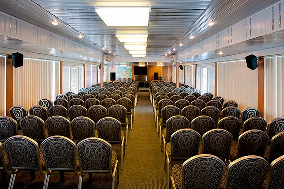 Конференц-зал на теплоходе «Николай Чернышевский» подойдет для организации деловых событий, конференций, семинаров и встреч. Расширен, дооборудован барными стойками. Теперь зал легко трансформируется в бар, оставляя пространство для гостей и артистов.